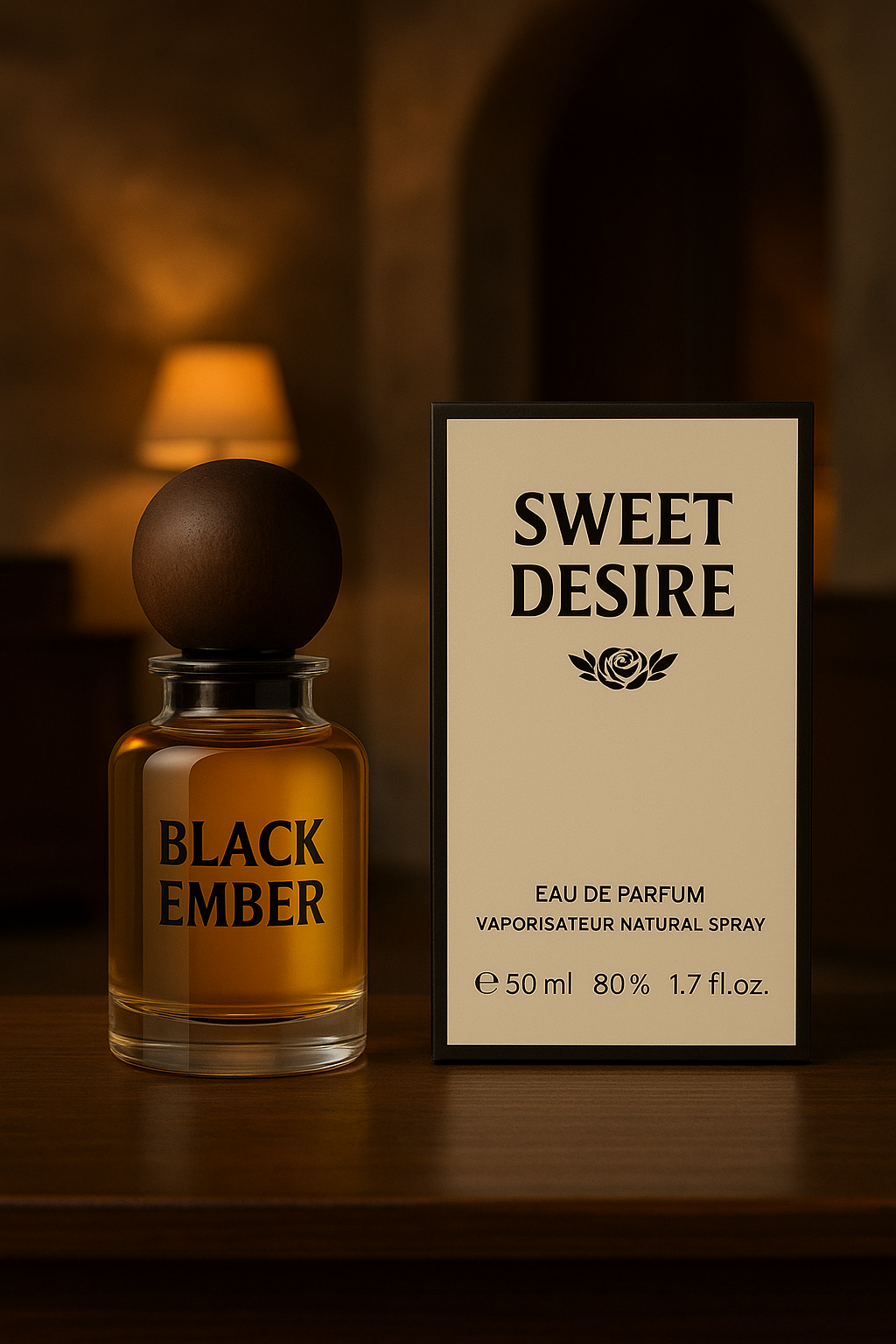 Black Ember opens with deep incense and green herbal notes, revealing a heart of oud and hashish accord, ending with dense woods and musk.